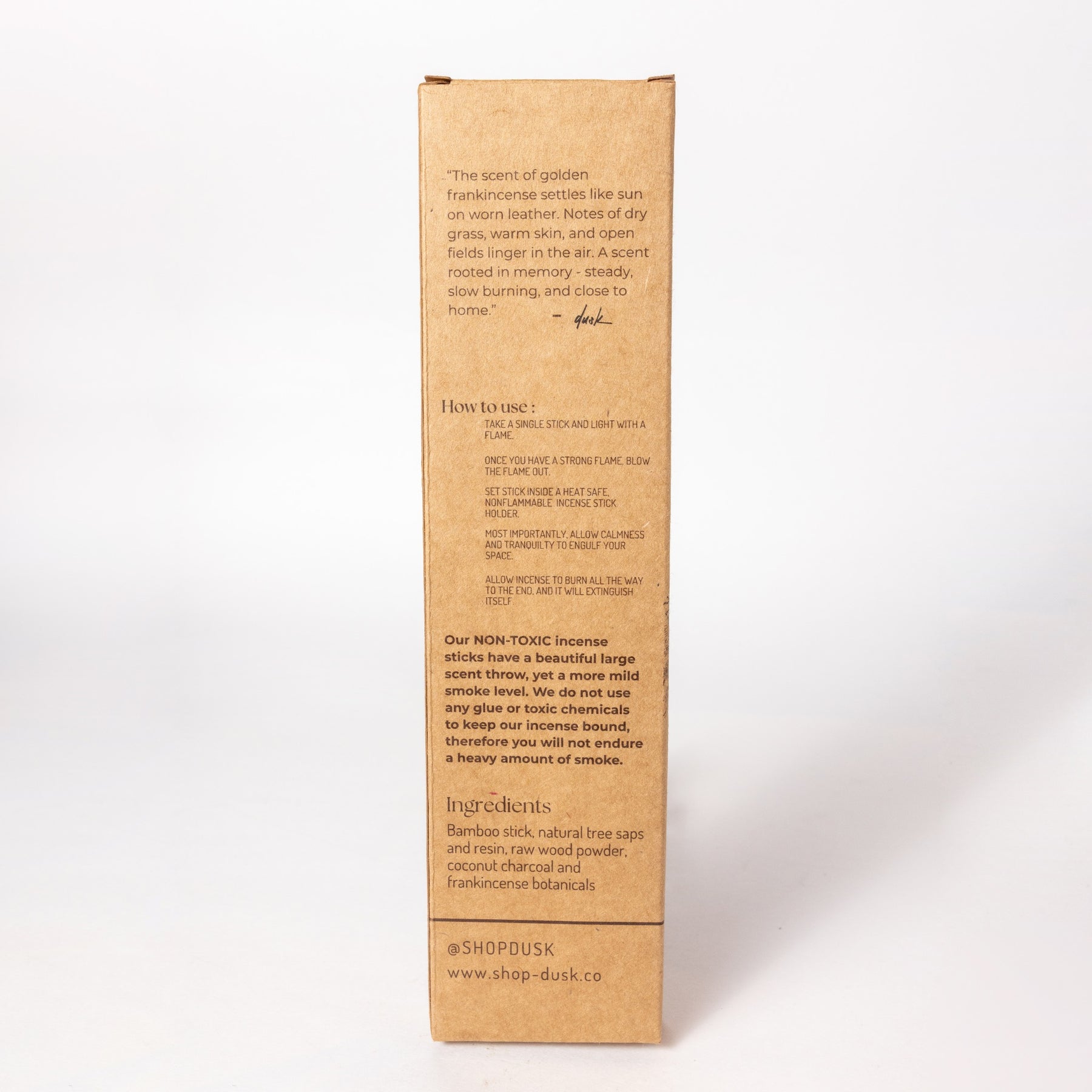 Our NON-TOXIC incense sticks have a beautiful large scent throw, yet a more mild smoke level. We do not use any glue or toxic chemicals to keep our incense bound, therefore you will not endure a heavy amount of smoke.